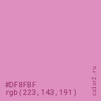 Цвет #DF8FBF в цветовой модели RGB обозначается тремя октетами (223, 143, 191) в десятичном формате и #DF8FBF в шестнадцатиричном (hex) формате, которые являются интенсивностью красного 223 (hex DF), интенсивность зелёного 143 (hex 8F) и интенсивность синего 191 (hex BF).