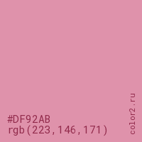 Цвет #DF92AB в цветовой модели RGB обозначается тремя октетами (223, 146, 171) в десятичном формате и #DF92AB в шестнадцатиричном (hex) формате, которые являются интенсивностью красного 223 (hex DF), интенсивность зелёного 146 (hex 92) и интенсивность синего 171 (hex AB).