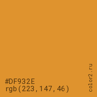 Цвет #DF932E в цветовой модели RGB обозначается тремя октетами (223, 147, 46) в десятичном формате и #DF932E в шестнадцатиричном (hex) формате, которые являются интенсивностью красного 223 (hex DF), интенсивность зелёного 147 (hex 93) и интенсивность синего 46 (hex 2E).