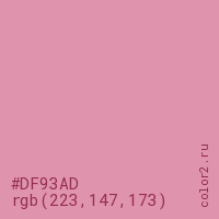 Цвет #DF93AD в цветовой модели RGB обозначается тремя октетами (223, 147, 173) в десятичном формате и #DF93AD в шестнадцатиричном (hex) формате, которые являются интенсивностью красного 223 (hex DF), интенсивность зелёного 147 (hex 93) и интенсивность синего 173 (hex AD).