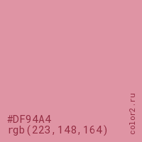 Цвет #DF94A4 в цветовой модели RGB обозначается тремя октетами (223, 148, 164) в десятичном формате и #DF94A4 в шестнадцатиричном (hex) формате, которые являются интенсивностью красного 223 (hex DF), интенсивность зелёного 148 (hex 94) и интенсивность синего 164 (hex A4).