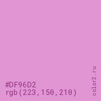 Цвет #DF96D2 в цветовой модели RGB обозначается тремя октетами (223, 150, 210) в десятичном формате и #DF96D2 в шестнадцатиричном (hex) формате, которые являются интенсивностью красного 223 (hex DF), интенсивность зелёного 150 (hex 96) и интенсивность синего 210 (hex D2).