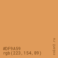 Цвет #DF9A59 в цветовой модели RGB обозначается тремя октетами (223, 154, 89) в десятичном формате и #DF9A59 в шестнадцатиричном (hex) формате, которые являются интенсивностью красного 223 (hex DF), интенсивность зелёного 154 (hex 9A) и интенсивность синего 89 (hex 59).
