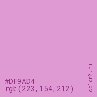 Цвет #DF9AD4 в цветовой модели RGB обозначается тремя октетами (223, 154, 212) в десятичном формате и #DF9AD4 в шестнадцатиричном (hex) формате, которые являются интенсивностью красного 223 (hex DF), интенсивность зелёного 154 (hex 9A) и интенсивность синего 212 (hex D4).