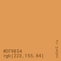 Цвет #DF9B54 в цветовой модели RGB обозначается тремя октетами (223, 155, 84) в десятичном формате и #DF9B54 в шестнадцатиричном (hex) формате, которые являются интенсивностью красного 223 (hex DF), интенсивность зелёного 155 (hex 9B) и интенсивность синего 84 (hex 54).