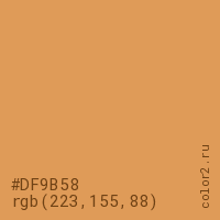 Цвет #DF9B58 в цветовой модели RGB обозначается тремя октетами (223, 155, 88) в десятичном формате и #DF9B58 в шестнадцатиричном (hex) формате, которые являются интенсивностью красного 223 (hex DF), интенсивность зелёного 155 (hex 9B) и интенсивность синего 88 (hex 58).