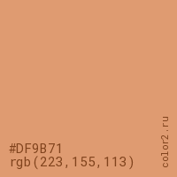 Цвет #DF9B71 в цветовой модели RGB обозначается тремя октетами (223, 155, 113) в десятичном формате и #DF9B71 в шестнадцатиричном (hex) формате, которые являются интенсивностью красного 223 (hex DF), интенсивность зелёного 155 (hex 9B) и интенсивность синего 113 (hex 71).