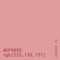 Цвет #DF9B9D в цветовой модели RGB обозначается тремя октетами (223, 155, 157) в десятичном формате и #DF9B9D в шестнадцатиричном (hex) формате, которые являются интенсивностью красного 223 (hex DF), интенсивность зелёного 155 (hex 9B) и интенсивность синего 157 (hex 9D).