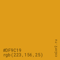 Цвет #DF9C19 в цветовой модели RGB обозначается тремя октетами (223, 156, 25) в десятичном формате и #DF9C19 в шестнадцатиричном (hex) формате, которые являются интенсивностью красного 223 (hex DF), интенсивность зелёного 156 (hex 9C) и интенсивность синего 25 (hex 19).