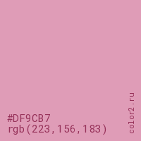 Цвет #DF9CB7 в цветовой модели RGB обозначается тремя октетами (223, 156, 183) в десятичном формате и #DF9CB7 в шестнадцатиричном (hex) формате, которые являются интенсивностью красного 223 (hex DF), интенсивность зелёного 156 (hex 9C) и интенсивность синего 183 (hex B7).