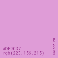 Цвет #DF9CD7 в цветовой модели RGB обозначается тремя октетами (223, 156, 215) в десятичном формате и #DF9CD7 в шестнадцатиричном (hex) формате, которые являются интенсивностью красного 223 (hex DF), интенсивность зелёного 156 (hex 9C) и интенсивность синего 215 (hex D7).