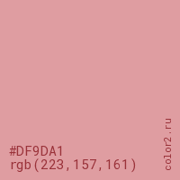 Цвет #DF9DA1 в цветовой модели RGB обозначается тремя октетами (223, 157, 161) в десятичном формате и #DF9DA1 в шестнадцатиричном (hex) формате, которые являются интенсивностью красного 223 (hex DF), интенсивность зелёного 157 (hex 9D) и интенсивность синего 161 (hex A1).