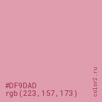 Цвет #DF9DAD в цветовой модели RGB обозначается тремя октетами (223, 157, 173) в десятичном формате и #DF9DAD в шестнадцатиричном (hex) формате, которые являются интенсивностью красного 223 (hex DF), интенсивность зелёного 157 (hex 9D) и интенсивность синего 173 (hex AD).