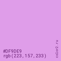 Цвет #DF9DE9 в цветовой модели RGB обозначается тремя октетами (223, 157, 233) в десятичном формате и #DF9DE9 в шестнадцатиричном (hex) формате, которые являются интенсивностью красного 223 (hex DF), интенсивность зелёного 157 (hex 9D) и интенсивность синего 233 (hex E9).