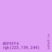 Цвет #DF9FF4 в цветовой модели RGB обозначается тремя октетами (223, 159, 244) в десятичном формате и #DF9FF4 в шестнадцатиричном (hex) формате, которые являются интенсивностью красного 223 (hex DF), интенсивность зелёного 159 (hex 9F) и интенсивность синего 244 (hex F4).