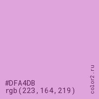 Цвет #DFA4DB в цветовой модели RGB обозначается тремя октетами (223, 164, 219) в десятичном формате и #DFA4DB в шестнадцатиричном (hex) формате, которые являются интенсивностью красного 223 (hex DF), интенсивность зелёного 164 (hex A4) и интенсивность синего 219 (hex DB).