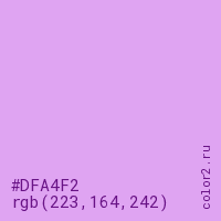 Цвет #DFA4F2 в цветовой модели RGB обозначается тремя октетами (223, 164, 242) в десятичном формате и #DFA4F2 в шестнадцатиричном (hex) формате, которые являются интенсивностью красного 223 (hex DF), интенсивность зелёного 164 (hex A4) и интенсивность синего 242 (hex F2).