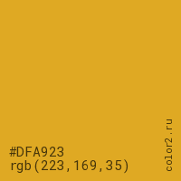 Цвет #DFA923 в цветовой модели RGB обозначается тремя октетами (223, 169, 35) в десятичном формате и #DFA923 в шестнадцатиричном (hex) формате, которые являются интенсивностью красного 223 (hex DF), интенсивность зелёного 169 (hex A9) и интенсивность синего 35 (hex 23).