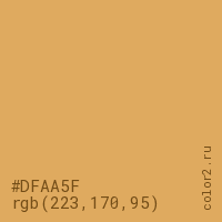 Цвет #DFAA5F в цветовой модели RGB обозначается тремя октетами (223, 170, 95) в десятичном формате и #DFAA5F в шестнадцатиричном (hex) формате, которые являются интенсивностью красного 223 (hex DF), интенсивность зелёного 170 (hex AA) и интенсивность синего 95 (hex 5F).
