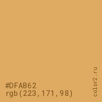 Цвет #DFAB62 в цветовой модели RGB обозначается тремя октетами (223, 171, 98) в десятичном формате и #DFAB62 в шестнадцатиричном (hex) формате, которые являются интенсивностью красного 223 (hex DF), интенсивность зелёного 171 (hex AB) и интенсивность синего 98 (hex 62).