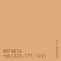 Цвет #DFAB7A в цветовой модели RGB обозначается тремя октетами (223, 171, 122) в десятичном формате и #DFAB7A в шестнадцатиричном (hex) формате, которые являются интенсивностью красного 223 (hex DF), интенсивность зелёного 171 (hex AB) и интенсивность синего 122 (hex 7A).