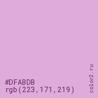 Цвет #DFABDB в цветовой модели RGB обозначается тремя октетами (223, 171, 219) в десятичном формате и #DFABDB в шестнадцатиричном (hex) формате, которые являются интенсивностью красного 223 (hex DF), интенсивность зелёного 171 (hex AB) и интенсивность синего 219 (hex DB).