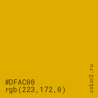Цвет #DFAC00 в цветовой модели RGB обозначается тремя октетами (223, 172, 0) в десятичном формате и #DFAC00 в шестнадцатиричном (hex) формате, которые являются интенсивностью красного 223 (hex DF), интенсивность зелёного 172 (hex AC) и интенсивность синего 0 (hex 00).