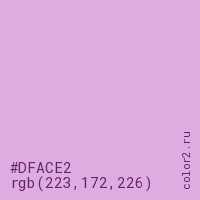 Цвет #DFACE2 в цветовой модели RGB обозначается тремя октетами (223, 172, 226) в десятичном формате и #DFACE2 в шестнадцатиричном (hex) формате, которые являются интенсивностью красного 223 (hex DF), интенсивность зелёного 172 (hex AC) и интенсивность синего 226 (hex E2).