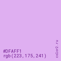 Цвет #DFAFF1 в цветовой модели RGB обозначается тремя октетами (223, 175, 241) в десятичном формате и #DFAFF1 в шестнадцатиричном (hex) формате, которые являются интенсивностью красного 223 (hex DF), интенсивность зелёного 175 (hex AF) и интенсивность синего 241 (hex F1).