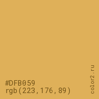 Цвет #DFB059 в цветовой модели RGB обозначается тремя октетами (223, 176, 89) в десятичном формате и #DFB059 в шестнадцатиричном (hex) формате, которые являются интенсивностью красного 223 (hex DF), интенсивность зелёного 176 (hex B0) и интенсивность синего 89 (hex 59).