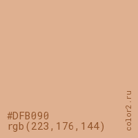 Цвет #DFB090 в цветовой модели RGB обозначается тремя октетами (223, 176, 144) в десятичном формате и #DFB090 в шестнадцатиричном (hex) формате, которые являются интенсивностью красного 223 (hex DF), интенсивность зелёного 176 (hex B0) и интенсивность синего 144 (hex 90).