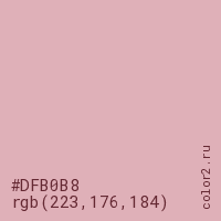 Цвет #DFB0B8 в цветовой модели RGB обозначается тремя октетами (223, 176, 184) в десятичном формате и #DFB0B8 в шестнадцатиричном (hex) формате, которые являются интенсивностью красного 223 (hex DF), интенсивность зелёного 176 (hex B0) и интенсивность синего 184 (hex B8).