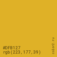 Цвет #DFB127 в цветовой модели RGB обозначается тремя октетами (223, 177, 39) в десятичном формате и #DFB127 в шестнадцатиричном (hex) формате, которые являются интенсивностью красного 223 (hex DF), интенсивность зелёного 177 (hex B1) и интенсивность синего 39 (hex 27).