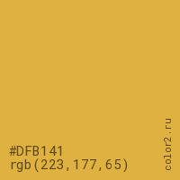 Цвет #DFB141 в цветовой модели RGB обозначается тремя октетами (223, 177, 65) в десятичном формате и #DFB141 в шестнадцатиричном (hex) формате, которые являются интенсивностью красного 223 (hex DF), интенсивность зелёного 177 (hex B1) и интенсивность синего 65 (hex 41).