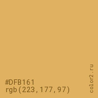 Цвет #DFB161 в цветовой модели RGB обозначается тремя октетами (223, 177, 97) в десятичном формате и #DFB161 в шестнадцатиричном (hex) формате, которые являются интенсивностью красного 223 (hex DF), интенсивность зелёного 177 (hex B1) и интенсивность синего 97 (hex 61).
