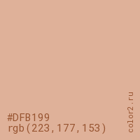 Цвет #DFB199 в цветовой модели RGB обозначается тремя октетами (223, 177, 153) в десятичном формате и #DFB199 в шестнадцатиричном (hex) формате, которые являются интенсивностью красного 223 (hex DF), интенсивность зелёного 177 (hex B1) и интенсивность синего 153 (hex 99).