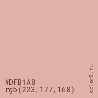 Цвет #DFB1A8 в цветовой модели RGB обозначается тремя октетами (223, 177, 168) в десятичном формате и #DFB1A8 в шестнадцатиричном (hex) формате, которые являются интенсивностью красного 223 (hex DF), интенсивность зелёного 177 (hex B1) и интенсивность синего 168 (hex A8).