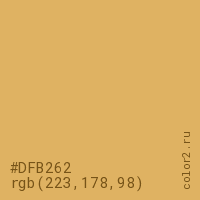 Цвет #DFB262 в цветовой модели RGB обозначается тремя октетами (223, 178, 98) в десятичном формате и #DFB262 в шестнадцатиричном (hex) формате, которые являются интенсивностью красного 223 (hex DF), интенсивность зелёного 178 (hex B2) и интенсивность синего 98 (hex 62).