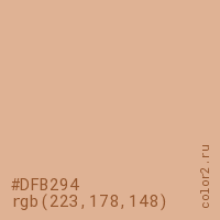 Цвет #DFB294 в цветовой модели RGB обозначается тремя октетами (223, 178, 148) в десятичном формате и #DFB294 в шестнадцатиричном (hex) формате, которые являются интенсивностью красного 223 (hex DF), интенсивность зелёного 178 (hex B2) и интенсивность синего 148 (hex 94).