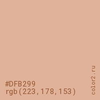 Цвет #DFB299 в цветовой модели RGB обозначается тремя октетами (223, 178, 153) в десятичном формате и #DFB299 в шестнадцатиричном (hex) формате, которые являются интенсивностью красного 223 (hex DF), интенсивность зелёного 178 (hex B2) и интенсивность синего 153 (hex 99).
