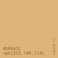 Цвет #DFB47C в цветовой модели RGB обозначается тремя октетами (223, 180, 124) в десятичном формате и #DFB47C в шестнадцатиричном (hex) формате, которые являются интенсивностью красного 223 (hex DF), интенсивность зелёного 180 (hex B4) и интенсивность синего 124 (hex 7C).