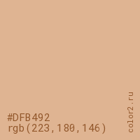 Цвет #DFB492 в цветовой модели RGB обозначается тремя октетами (223, 180, 146) в десятичном формате и #DFB492 в шестнадцатиричном (hex) формате, которые являются интенсивностью красного 223 (hex DF), интенсивность зелёного 180 (hex B4) и интенсивность синего 146 (hex 92).