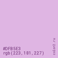 Цвет #DFB5E3 в цветовой модели RGB обозначается тремя октетами (223, 181, 227) в десятичном формате и #DFB5E3 в шестнадцатиричном (hex) формате, которые являются интенсивностью красного 223 (hex DF), интенсивность зелёного 181 (hex B5) и интенсивность синего 227 (hex E3).