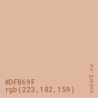 Цвет #DFB69F в цветовой модели RGB обозначается тремя октетами (223, 182, 159) в десятичном формате и #DFB69F в шестнадцатиричном (hex) формате, которые являются интенсивностью красного 223 (hex DF), интенсивность зелёного 182 (hex B6) и интенсивность синего 159 (hex 9F).