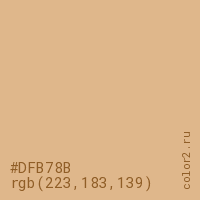 Цвет #DFB78B в цветовой модели RGB обозначается тремя октетами (223, 183, 139) в десятичном формате и #DFB78B в шестнадцатиричном (hex) формате, которые являются интенсивностью красного 223 (hex DF), интенсивность зелёного 183 (hex B7) и интенсивность синего 139 (hex 8B).