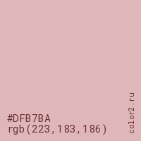 Цвет #DFB7BA в цветовой модели RGB обозначается тремя октетами (223, 183, 186) в десятичном формате и #DFB7BA в шестнадцатиричном (hex) формате, которые являются интенсивностью красного 223 (hex DF), интенсивность зелёного 183 (hex B7) и интенсивность синего 186 (hex BA).