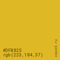 Цвет #DFB825 в цветовой модели RGB обозначается тремя октетами (223, 184, 37) в десятичном формате и #DFB825 в шестнадцатиричном (hex) формате, которые являются интенсивностью красного 223 (hex DF), интенсивность зелёного 184 (hex B8) и интенсивность синего 37 (hex 25).