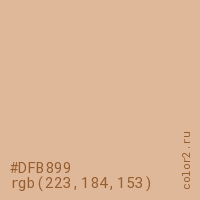 Цвет #DFB899 в цветовой модели RGB обозначается тремя октетами (223, 184, 153) в десятичном формате и #DFB899 в шестнадцатиричном (hex) формате, которые являются интенсивностью красного 223 (hex DF), интенсивность зелёного 184 (hex B8) и интенсивность синего 153 (hex 99).