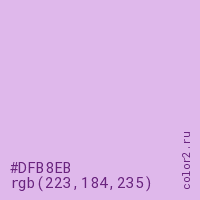 Цвет #DFB8EB в цветовой модели RGB обозначается тремя октетами (223, 184, 235) в десятичном формате и #DFB8EB в шестнадцатиричном (hex) формате, которые являются интенсивностью красного 223 (hex DF), интенсивность зелёного 184 (hex B8) и интенсивность синего 235 (hex EB).