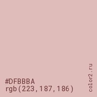 Цвет #DFBBBA в цветовой модели RGB обозначается тремя октетами (223, 187, 186) в десятичном формате и #DFBBBA в шестнадцатиричном (hex) формате, которые являются интенсивностью красного 223 (hex DF), интенсивность зелёного 187 (hex BB) и интенсивность синего 186 (hex BA).